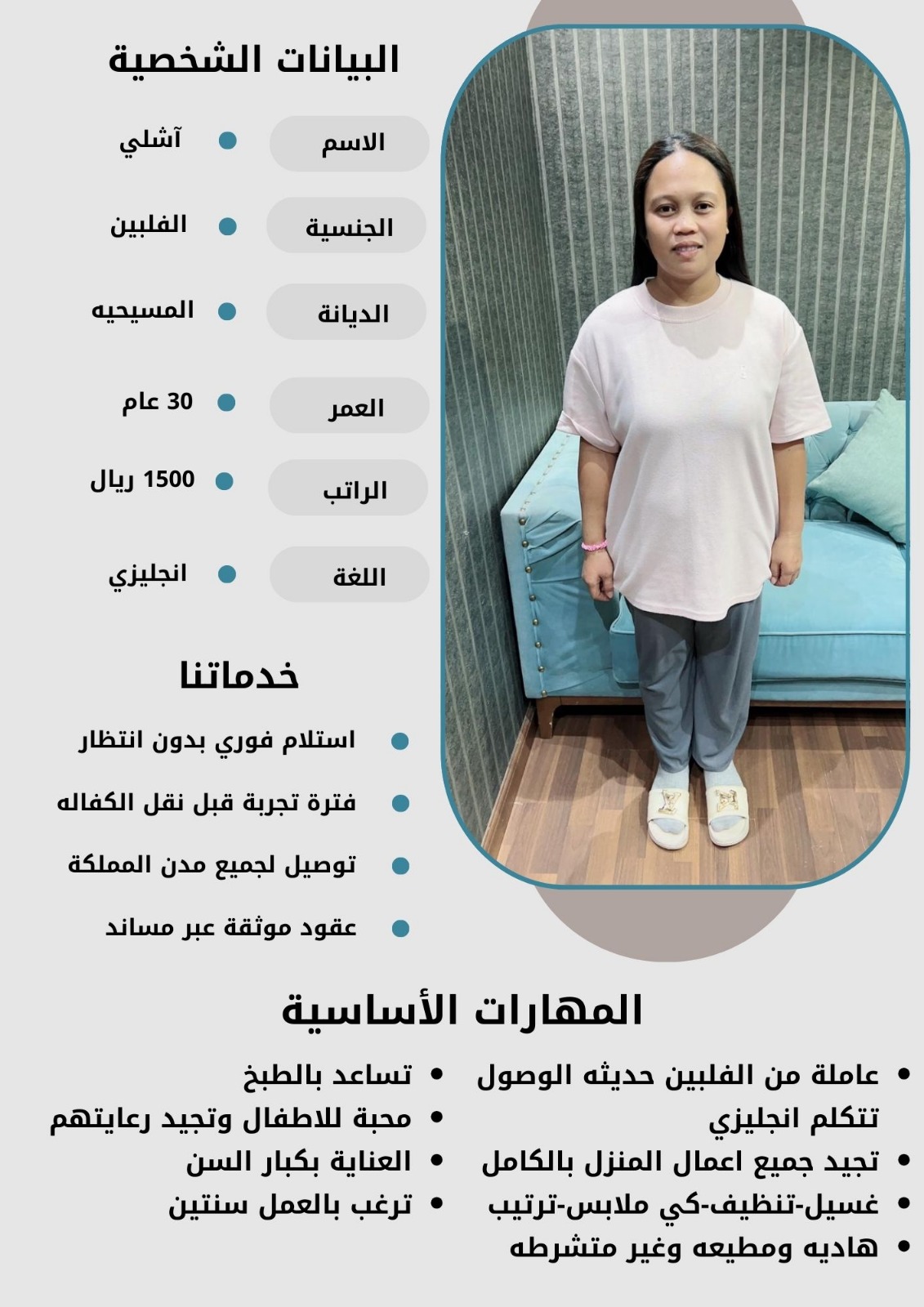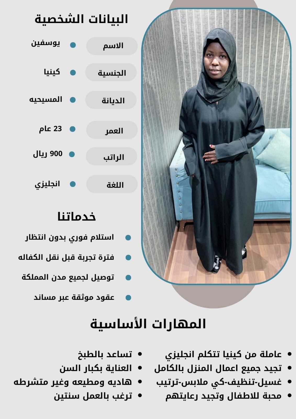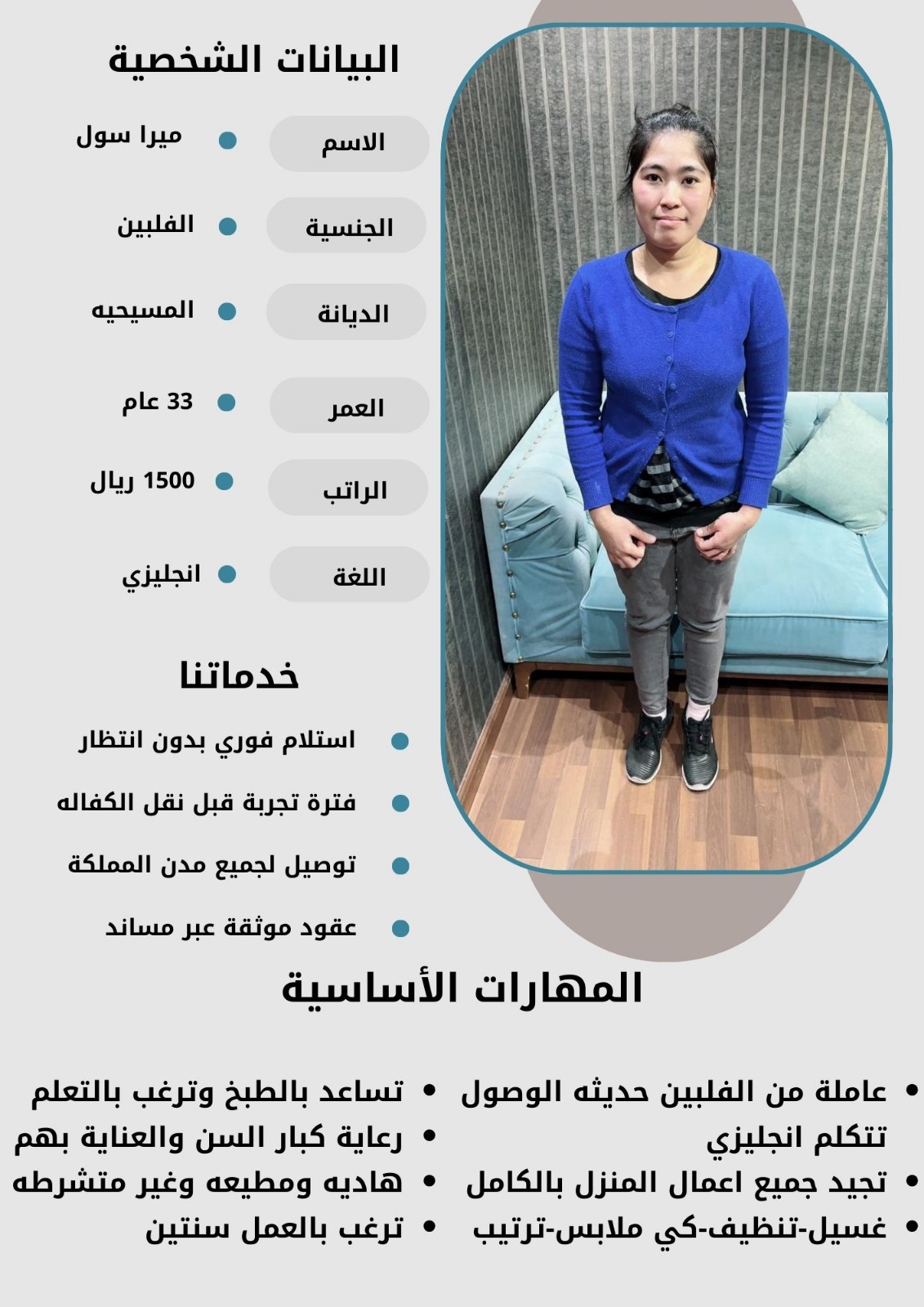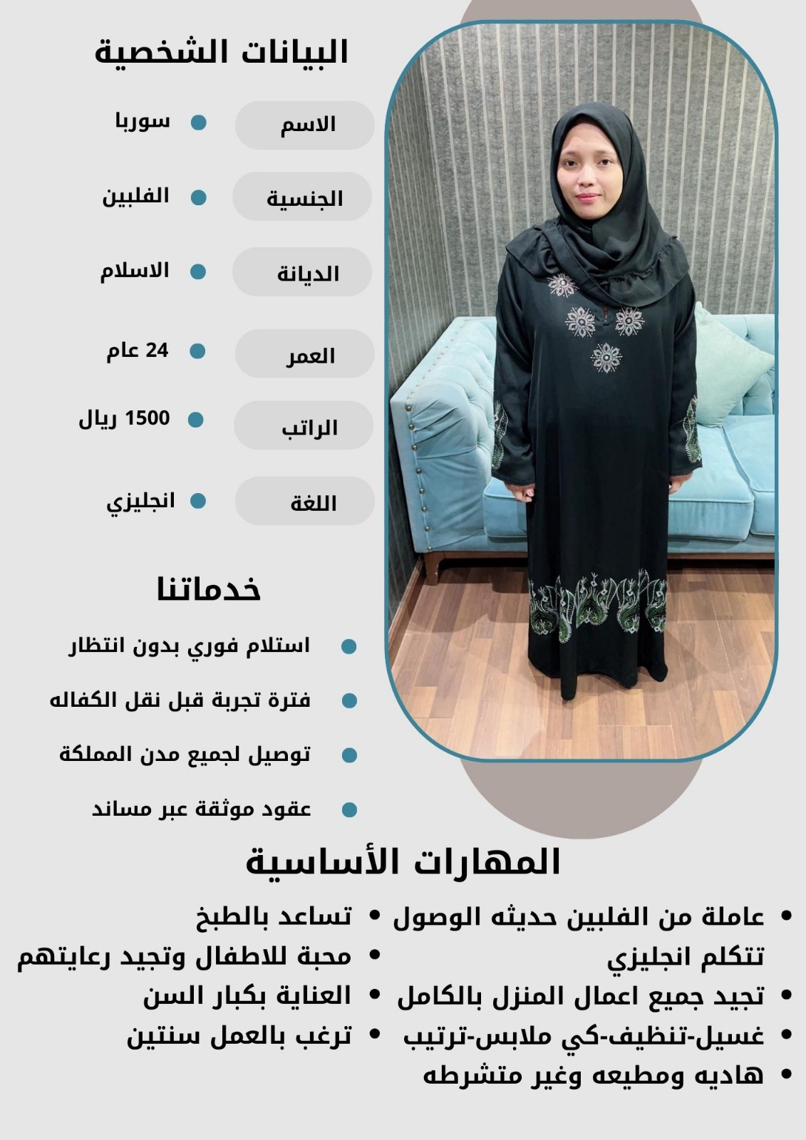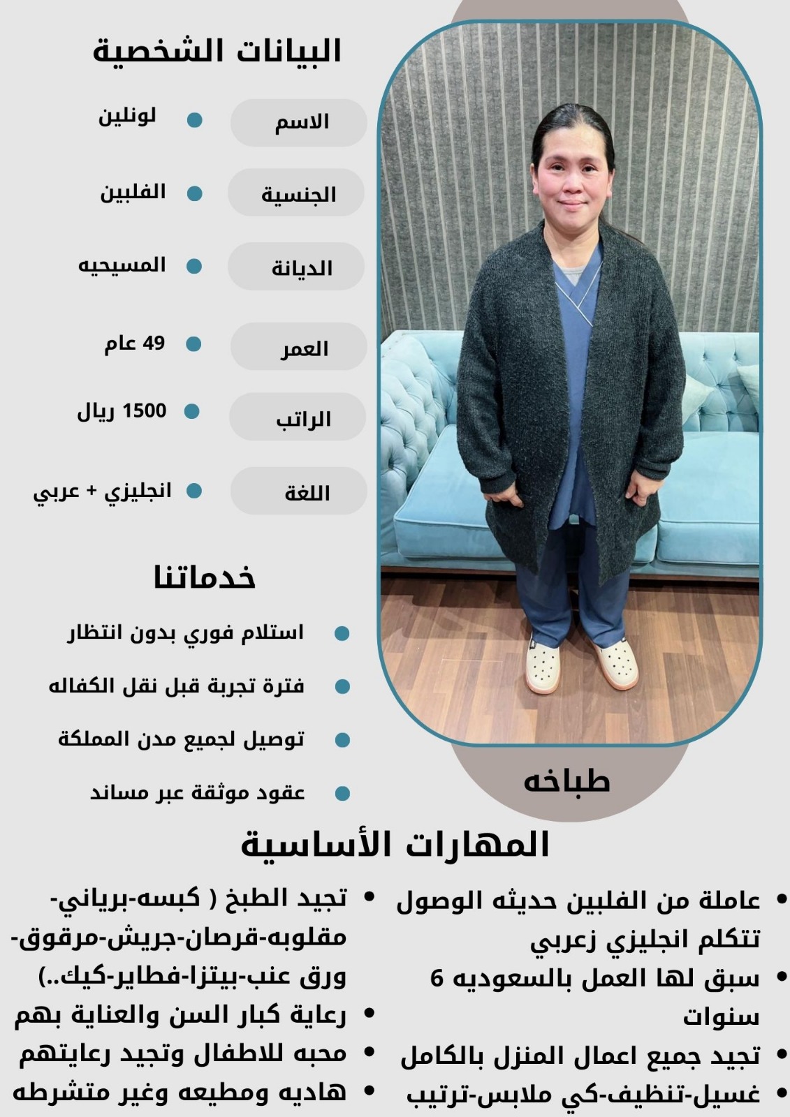 - نقدم لكم خيارات متعددة من العاملات بمختلف الجنسيات والأعمار لتناسب احتياجاتكم الخاصة.
