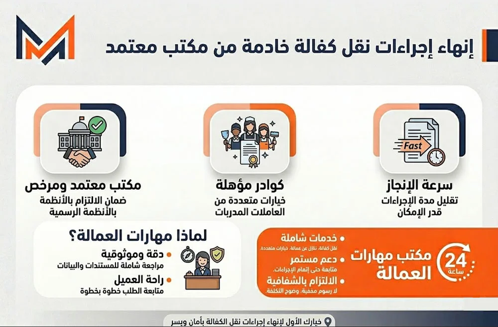 في هذا المقال نشرح بالتفصيل خطوات نقل كفالة عاملة منزلية من خلال مكتب معتمد، وأهم المزايا التي يوفرها لك هذا الخيار.